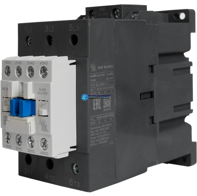 Контактор магнитный BA47 MC-65D22BNE 3P 2NO+2NC/65A/24~60VDC, код 418729, производитель АКЭЛ