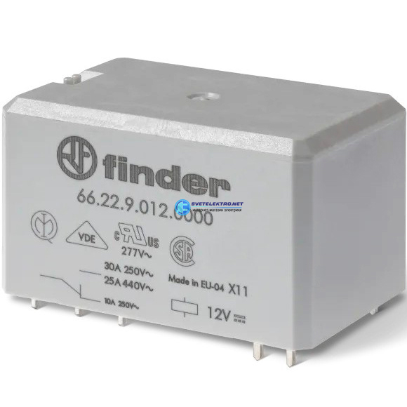 Реле силовое электромеханическое, монтаж на печатную плату, раздвоенные выводы, 2NO 30A (зазор ? 1.5мм), контакты AgSnO2, катушка 12В DC, степень защи, код 66.22.9.012.4600, производитель FINDER
