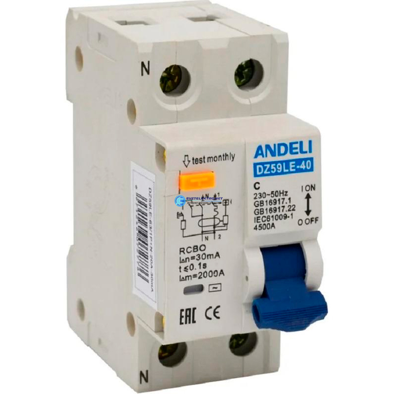Выключатель автоматический дифференциальный АВДТ 1P+N 25A 30mA С 4.5кА DZ59le-40, код ADL02-054, производитель ANDELI