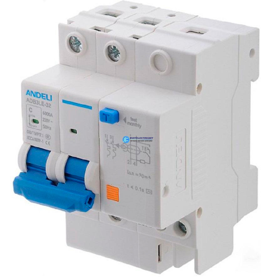 Выключатель автоматический дифференциальный АВДТ 2P 10A 30mA AC х-ка C 6кА ADB3le-32, код ADL02-060, производитель ANDELI