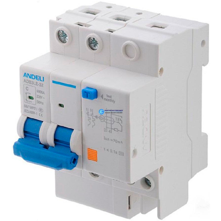 Выключатель автоматический дифференциальный АВДТ 2P 16A 30mA AC х-ка C 6кА ADB3le-32, код ADL02-061, производитель ANDELI