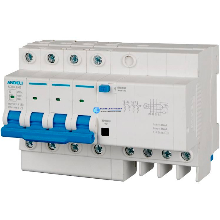 Выключатель автоматический дифференциальный АВДТ 4P 63A 30mA AC х-ка C 6кА ADB3le-63, код ADL02-075, производитель ANDELI
