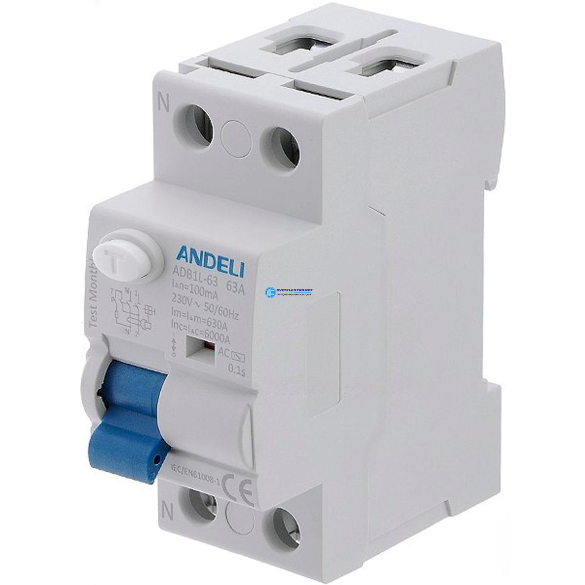 Выключатель дифференциального тока (УЗО) 2P 50A 100mA AC 6кА ADB1L-63, код ADL03-030, производитель ANDELI