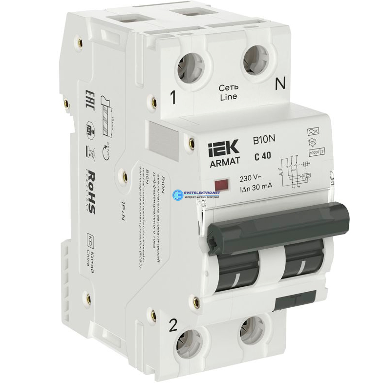 Автоматический выключатель дифференциального тока АВДТ 1P+NP C40 30мА тип (36мм), код AR-B10N-1N-C040A030, производитель IEK