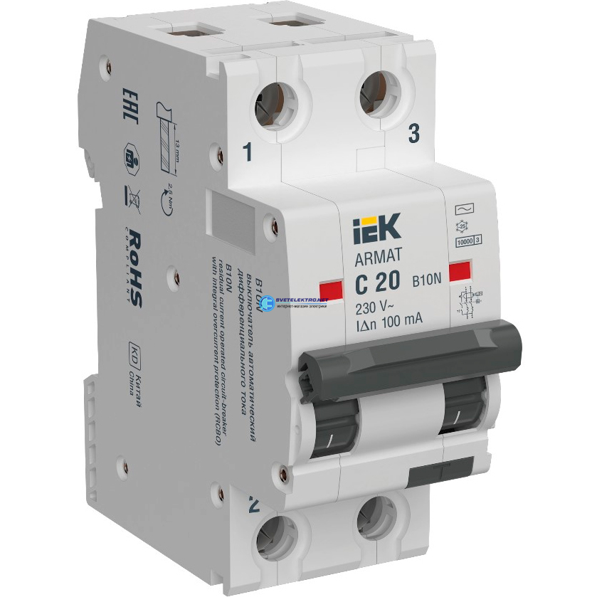 ARMAT Автоматический выключатель дифференциального тока 2P C20 100мА тип AC, код AR-B10N-2-C020C100, производитель IEK
