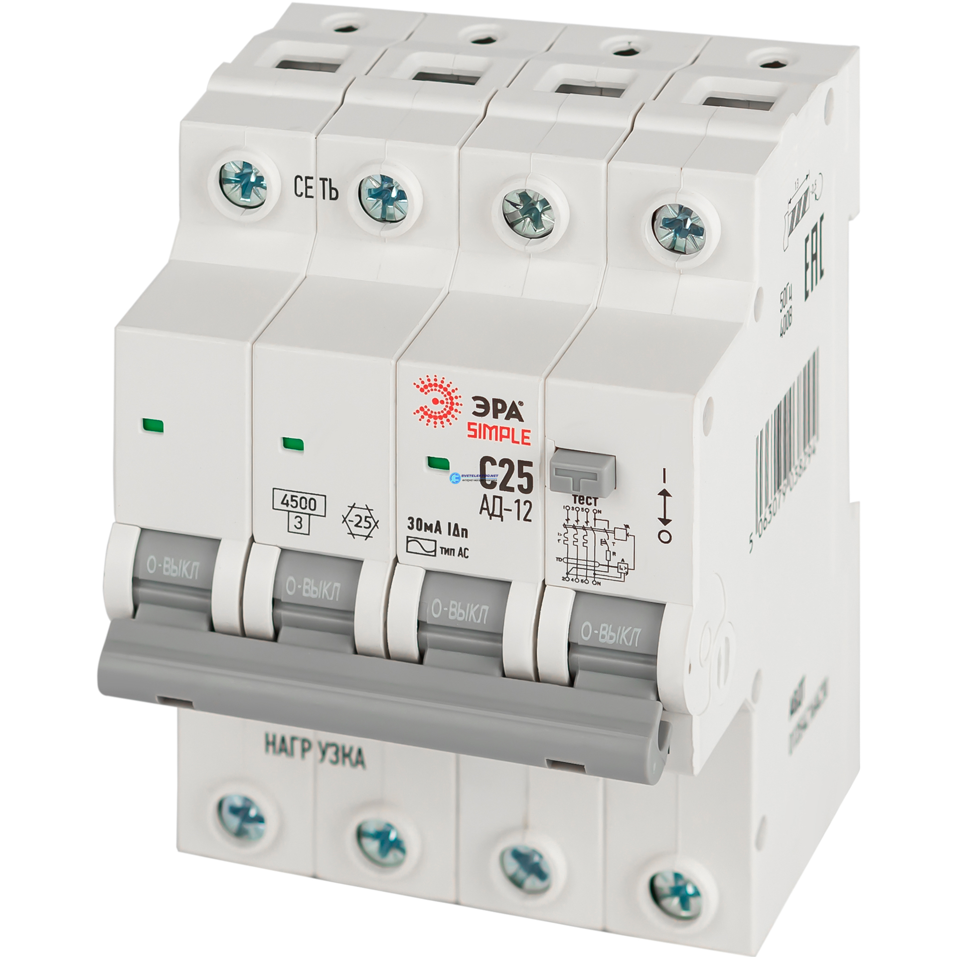 Выключатель автоматический дифференциальный электронный АВДТ 4,5кА SIMPLE D12E4C25AC30 АД-12 3P+N С25 30мА тип АС, код Б0058928, производитель ЭРА