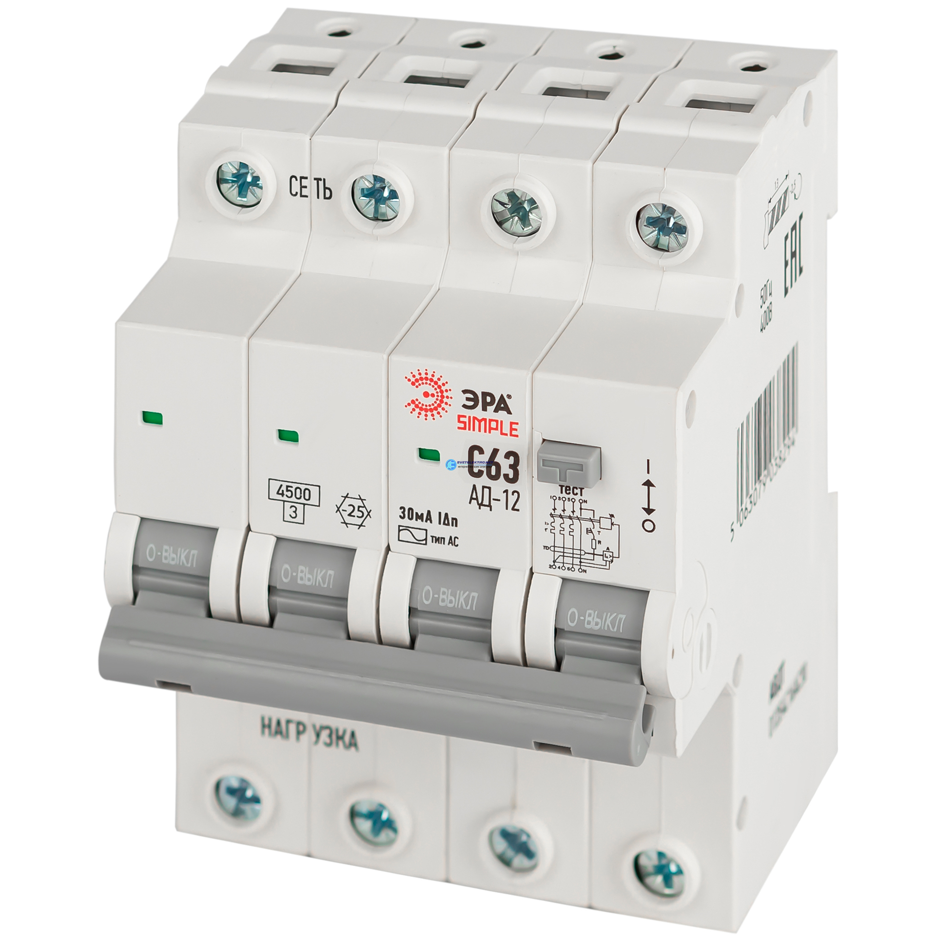 Выключатель автоматический дифференциальный электронный АВДТ 4,5кА SIMPLE D12E4C63AC30 АД-12 3P+N С63 30мА тип АС, код Б0058931, производитель ЭРА