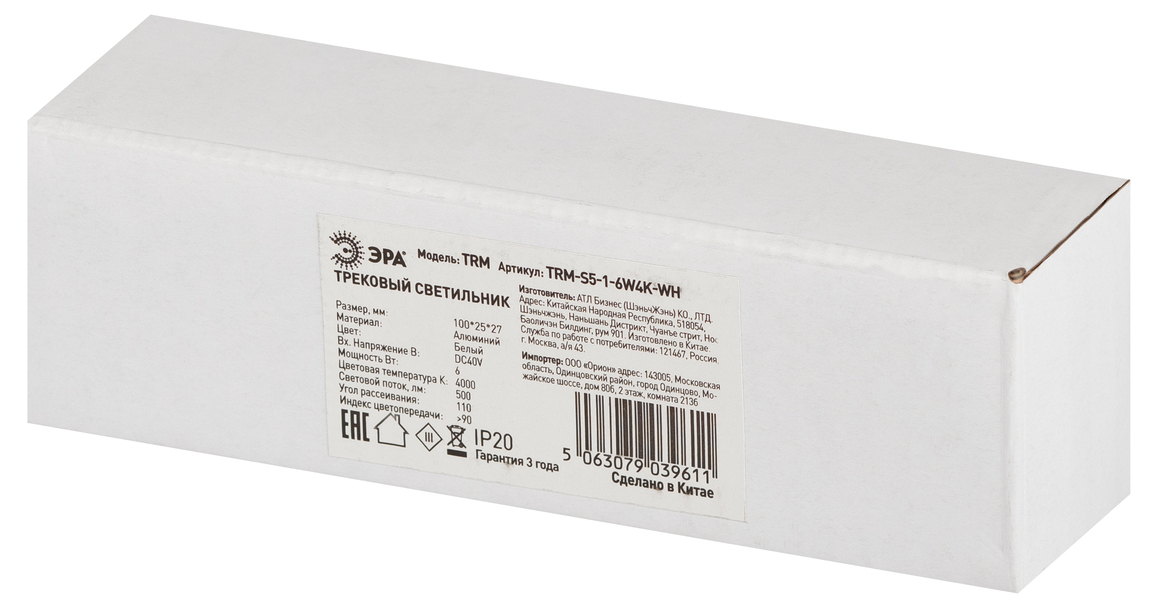 Светильник светодиодный трековый с заливающим светом для тонкой магнитной системы 6Вт 4000К белый TRM-S5-1-6W4K-WH, код Б0059041, производитель ЭРА