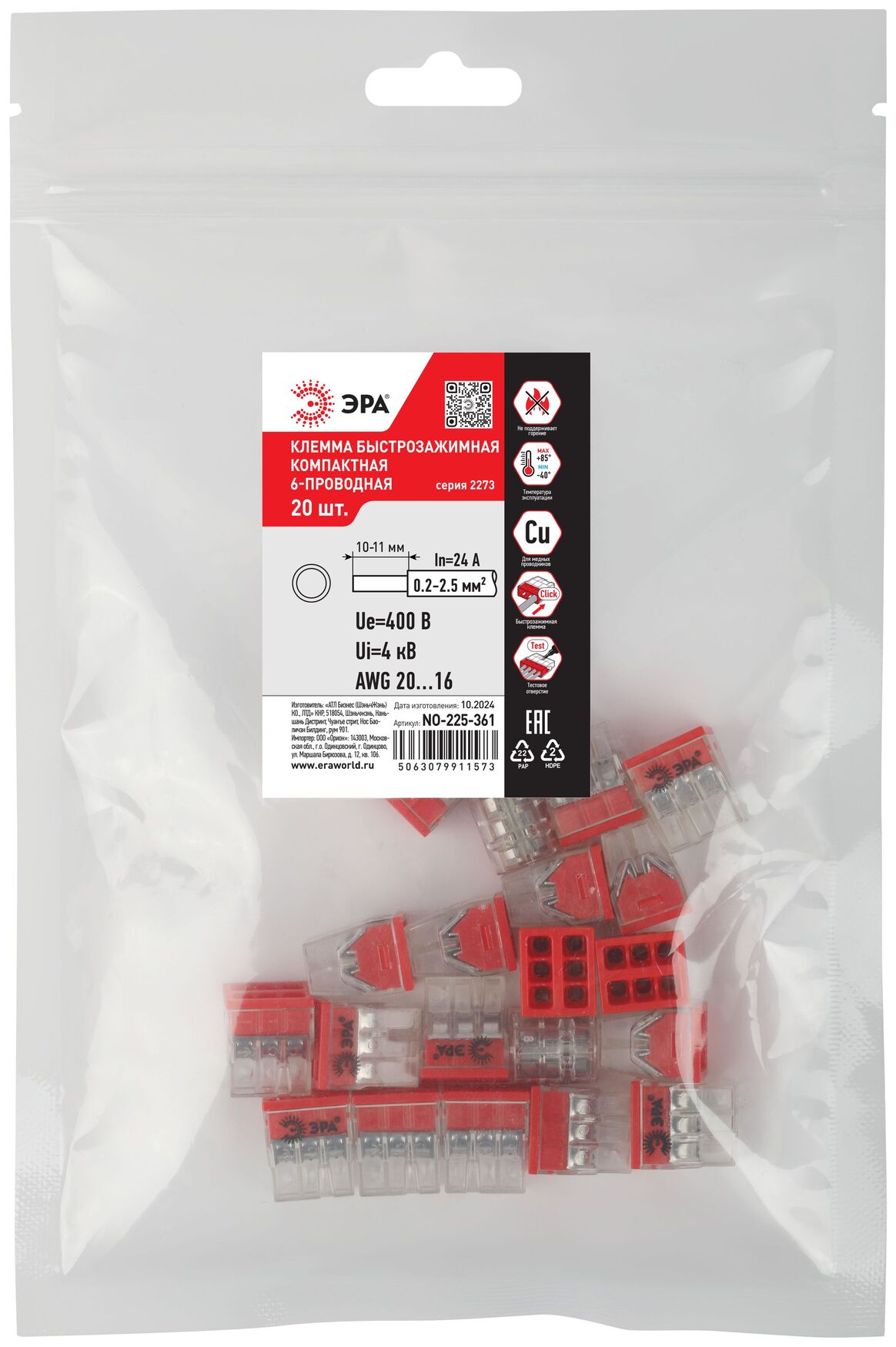 Клемма быстрозажимная 2273-206 компактная 6-проводная 0.2-2.5 мм2 NO-225-361 (упаковка 20 шт.), код Б0067919, производитель ЭРА