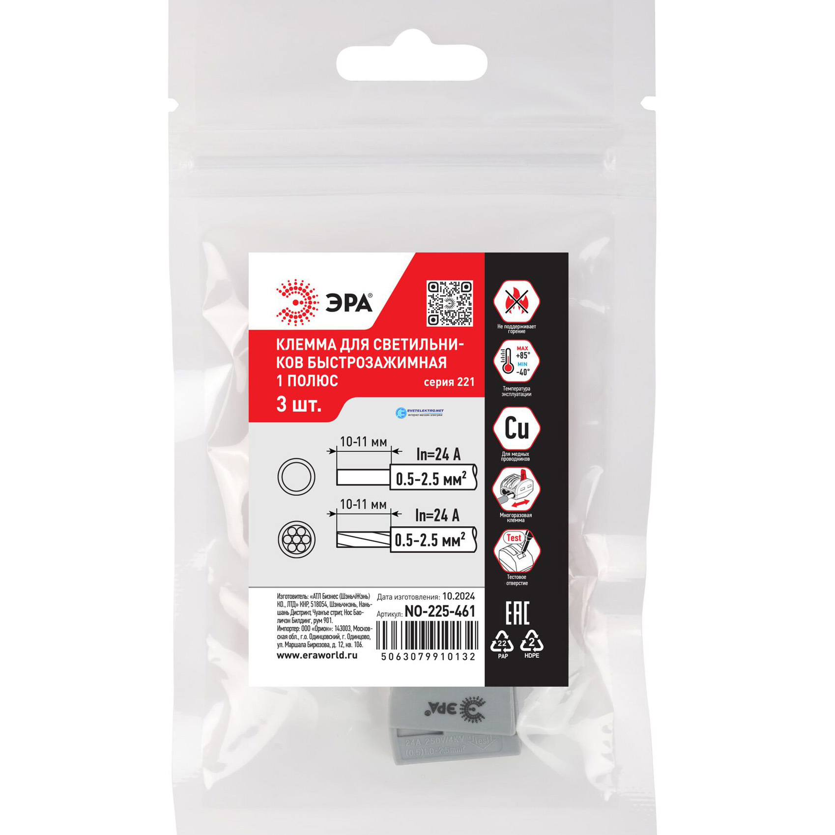 Клемма быстрозажимная 221-101 для светильников 1 полюс 0.5-2.5мм2 NO-225-461 (упаковка 3 шт.), код Б0067985, производитель ЭРА