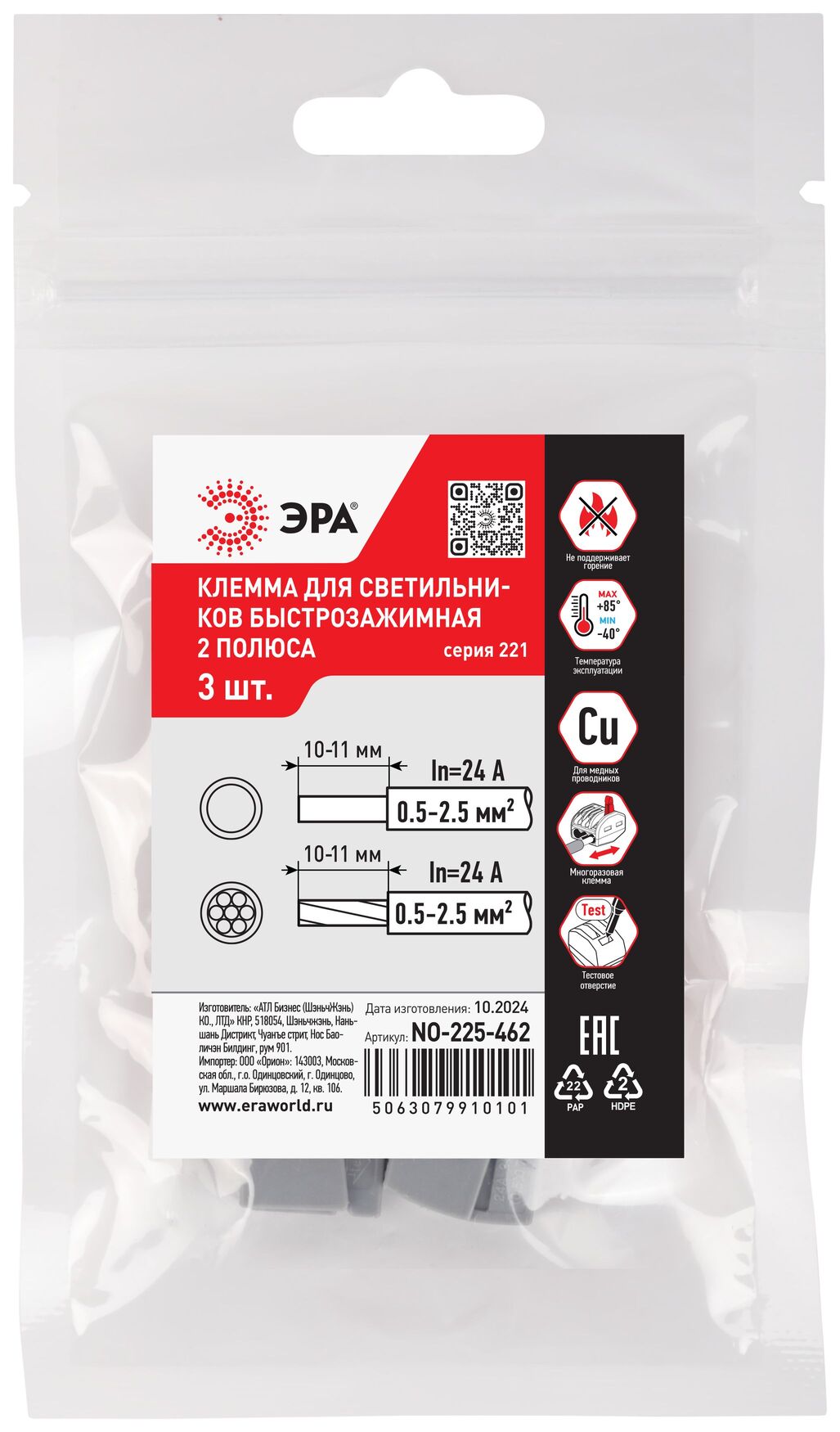 Клемма быстрозажимная 221-112 для светильников 2 полюса 0.5-2.5мм2 NO-225-462 (упаковка 3 шт.), код Б0067990, производитель ЭРА