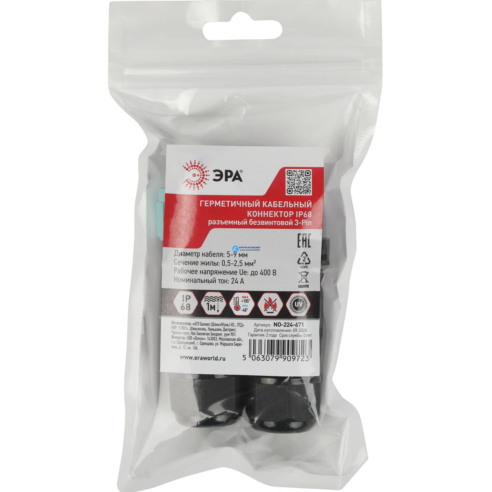 Коннектор кабельный разъёмный прямой 3-Pin 0.5-2.5 мм2 NO-224-671 безвинтовой IP68, код Б0068012, производитель ЭРА