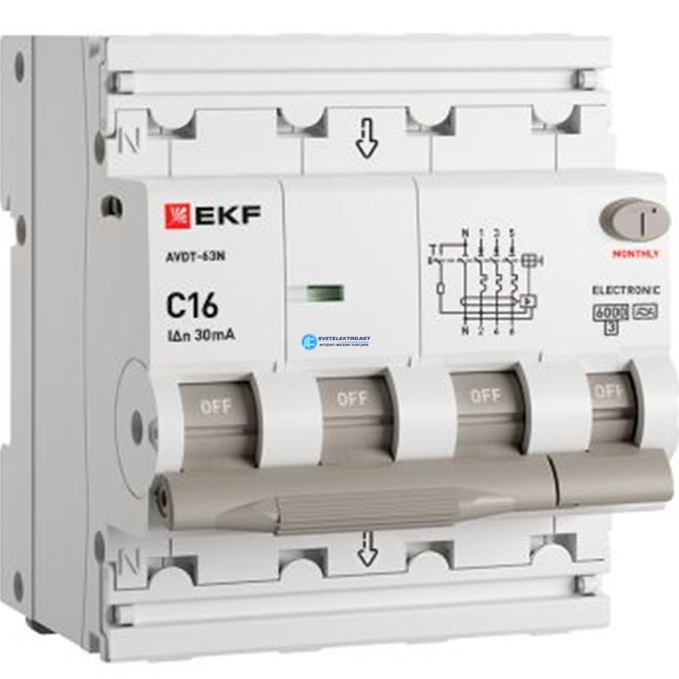 Автоматический выключатель дифференциального тока АВДТ-63N 3P+N 16А 30мА характеристика тип электронный 6кА, код D63N46EA16C30, производитель EKF
