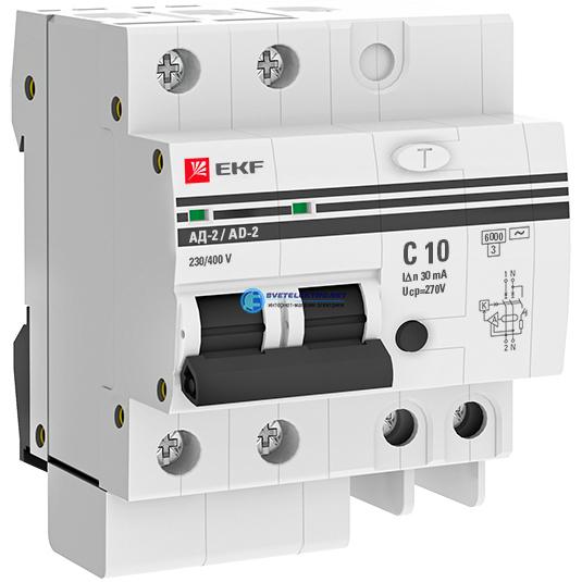 Дифференциальный автомат АД-2 10А/ 30мА (хар. C, AC, электронный, защита 270В) 6кА PROxima, код DA2-6-10-30-pro, производитель EKF