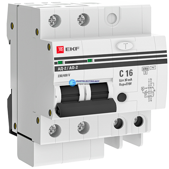 Дифференциальный автомат АД-2 16А/ 30мА (хар. C, AC, электронный, защита 270В) 6кА PROxima, код DA2-6-16-30-pro, производитель EKF