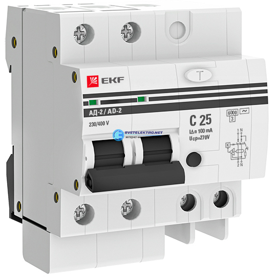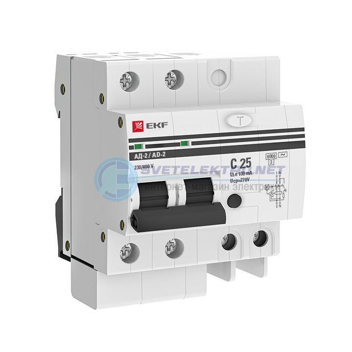Дифференциальный автомат АД-2 25А/100мА (хар. C, AC, электронный, защита 270В) 6кА PROxima, код DA2-6-25-100-pro, производитель EKF