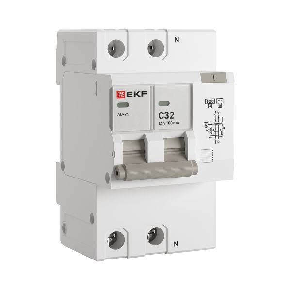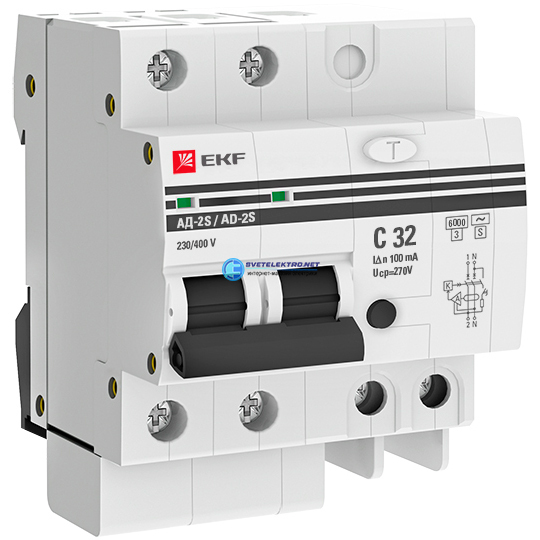 Дифференциальный автомат АД-2 32А/100мА (хар. C, AC, электронный, защита 270В) 6кА PROxima, код DA2-6-32-100S-pro, производитель EKF