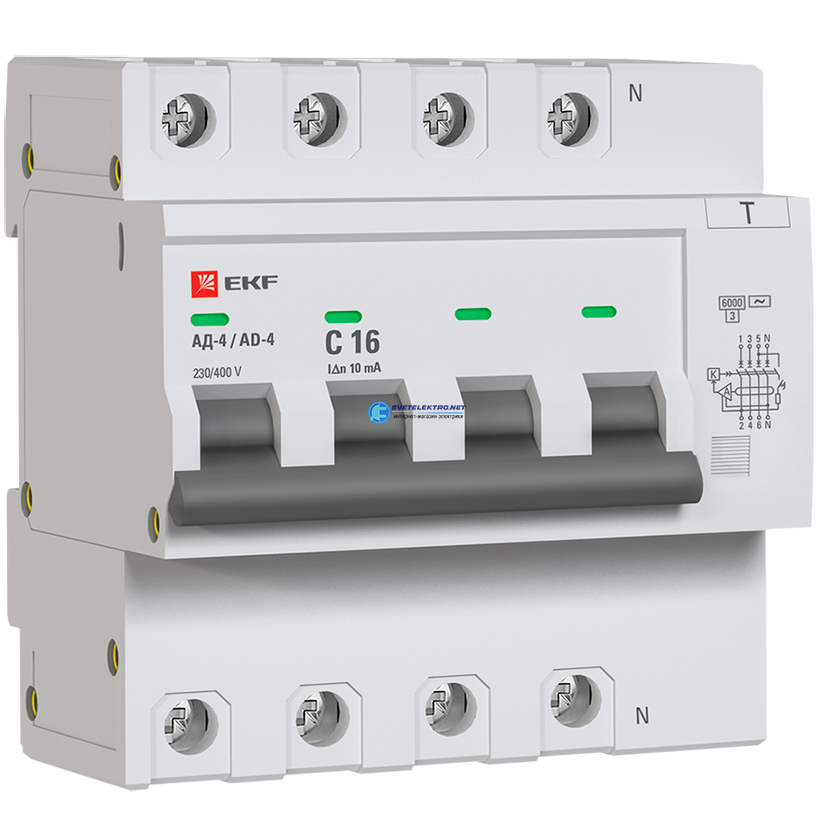 Дифференциальный автомат АД-4 16А/10мА (х-ка C, АС, электронный) 6кА PROxima, код DA4-6-16-10-pro, производитель EKF
