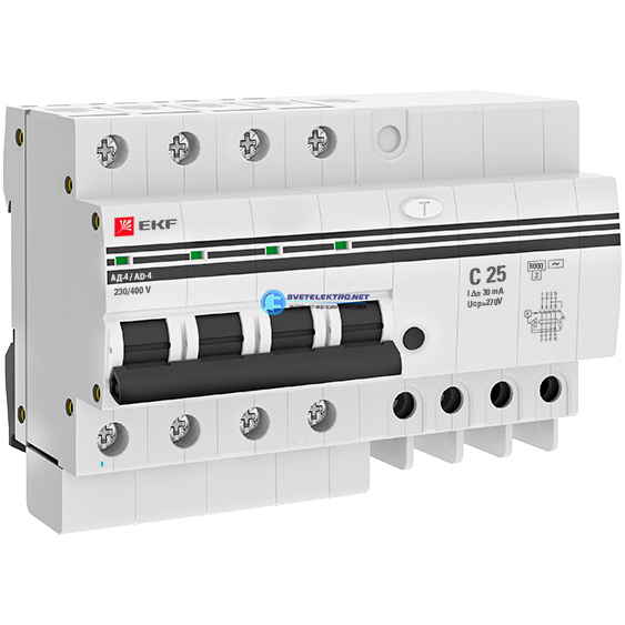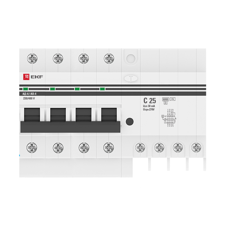 Дифференциальный автомат АД-4 25А/ 30мА (хар. C, AC, электронный, защита 270В) 6кА PROxima, код DA4-6-25-30-pro, производитель EKF