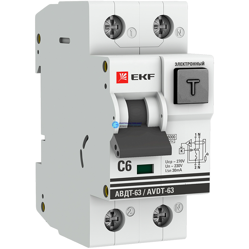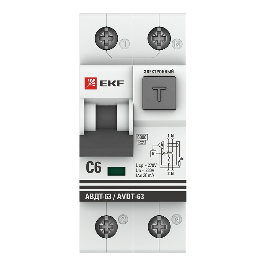 Дифференциальный автомат АВДТ-63 6А/ 30мА (хар-ка C, электронный тип АС) 6кА PROxima, код DA63-6-30e-AC, производитель EKF