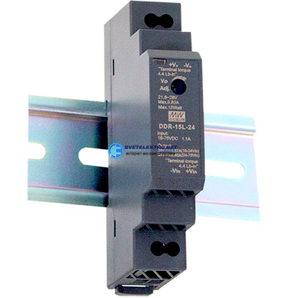 Преобразователь DC-DC, 15Вт, вход 18-75 В DC, выход 24В/0.63А, в кожухе на DIN-рейку, код DDR-15L-24, производитель Mean Well