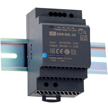 Преобразователь DC-DC, 60Вт, вход 18-75 В DC, выход 24В,2.5А, в кожухе на DIN-рейку, код DDR-60L-24, производитель Mean Well