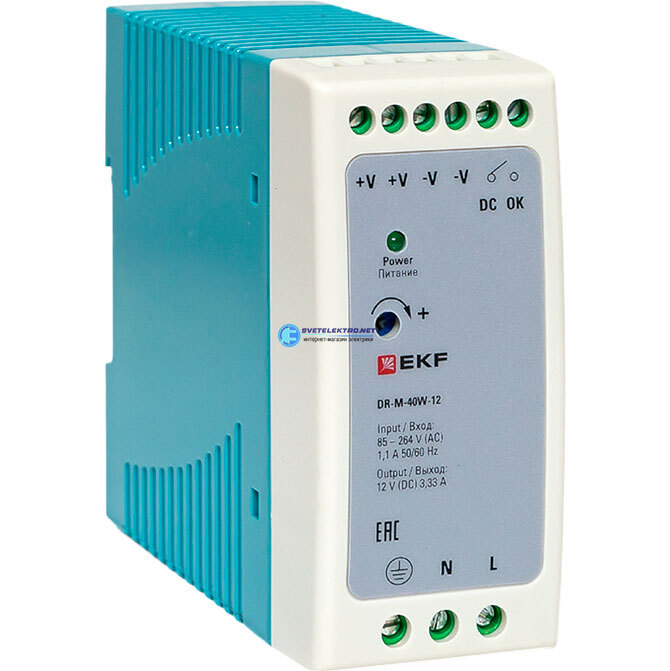 Блок питания на дин рейку Вт, 220 В AC /12 В DC, код DR-M-40W-12, производитель EKF