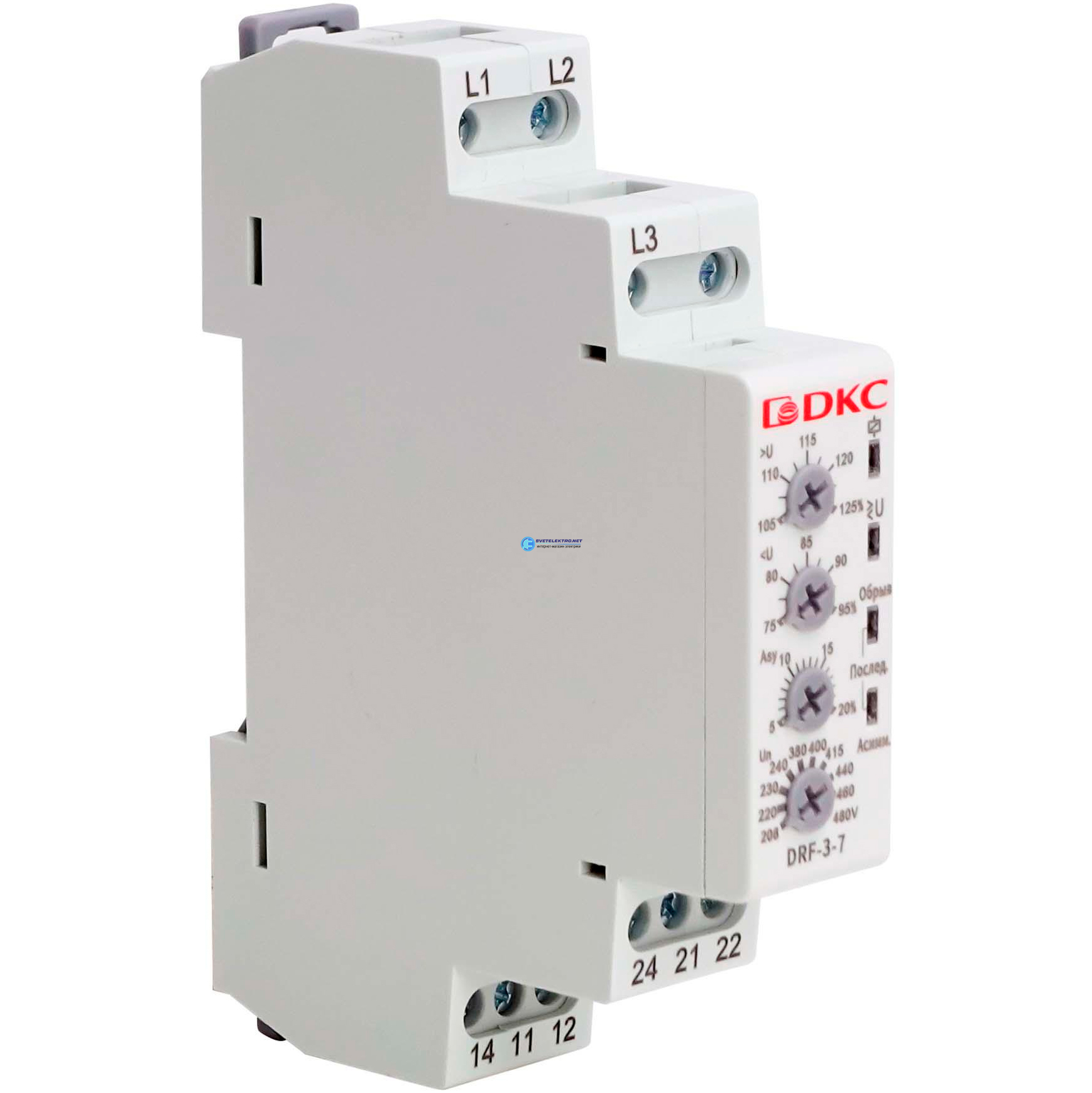 Реле контроля фаз, фазы + N, тип DRF, контроль напряжения , контроль обрыва фаз, котроль чередования фаз, контроль асимметрии, конфигурация контакта, код DRF-3-7N, производитель DKC