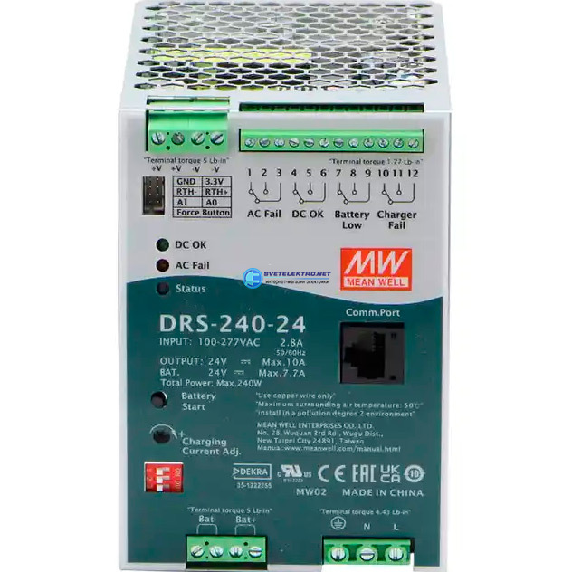 Блок питания AC-DC с функцией UPS c MODBus интерфейсом, 240Вт, вход 90-305В АС/127-431В DC, выход: 24В, выход зарядного устройства: 0-30В/0-10 А, в ко, код DRS-240-24, производитель Mean Well