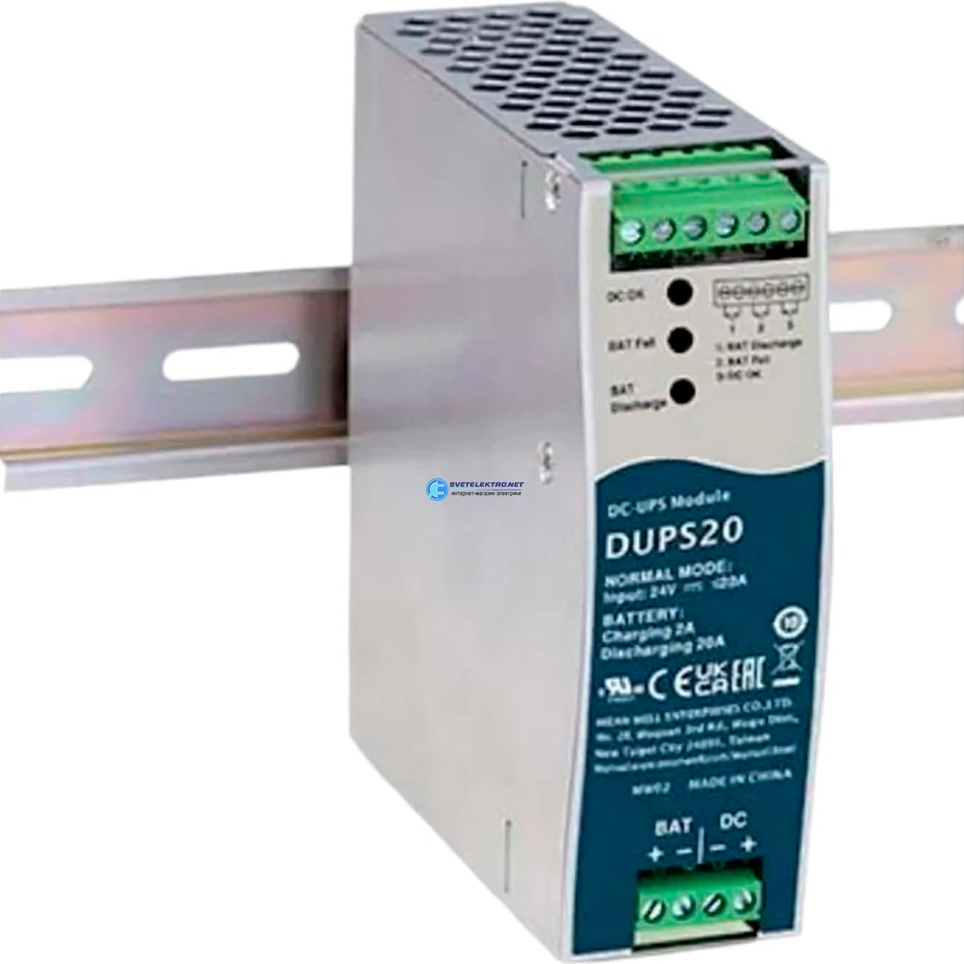 Модуль бесперебойного питания постоянного тока, ёмк.АКБ 4...135А-ч, ток.заряда 2А, вход 24...29В DC, выход 21...29В-20А, код DUPS20, производитель Mean Well