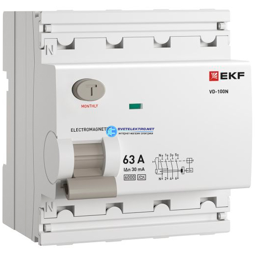 Выключатель дифференциального тока ВД-100N 4P 63А 30мА тип эл-мех 6кА, код E1046MA6330, производитель EKF