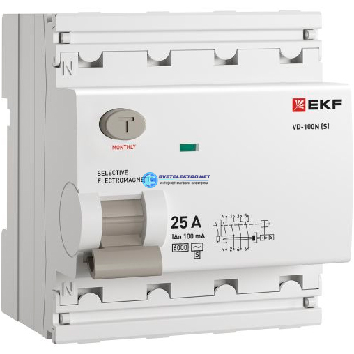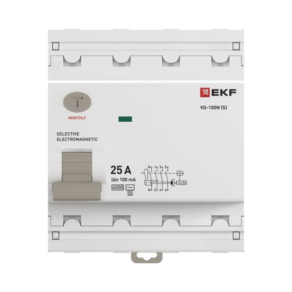 Выключатель дифференциального тока ВД-100N 4P 25А 100мА тип AC эл-мех 6кА PROXIMA, код E1046MS25100, производитель EKF