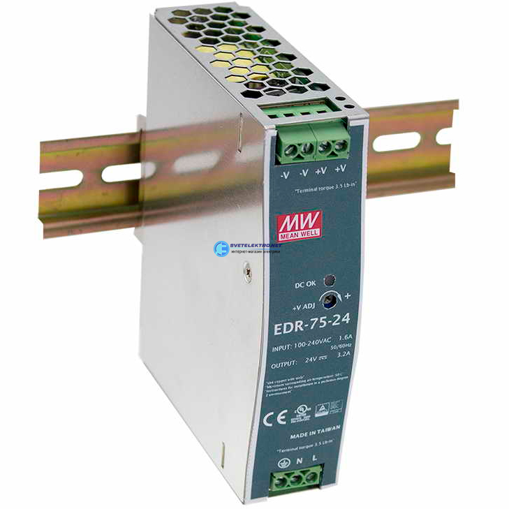 Блок питания AC-DC, 77Вт, вход 90-264V AC, 47-63Гц,127-370В DC, выход 24В,3.2A, рег. вых 24-28В, в кожухе на DIN-рейку, код EDR-75-24, производитель Mean Well