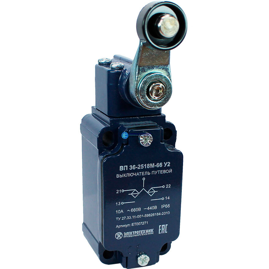 ВП 36-2518М-66 У2, рычаг с пластиковым роликом, 1з+1р, инерционный, 30х60 мм, без сальника, 3А, IP66, выключатель путевой, код ET007271, производитель Электротехник