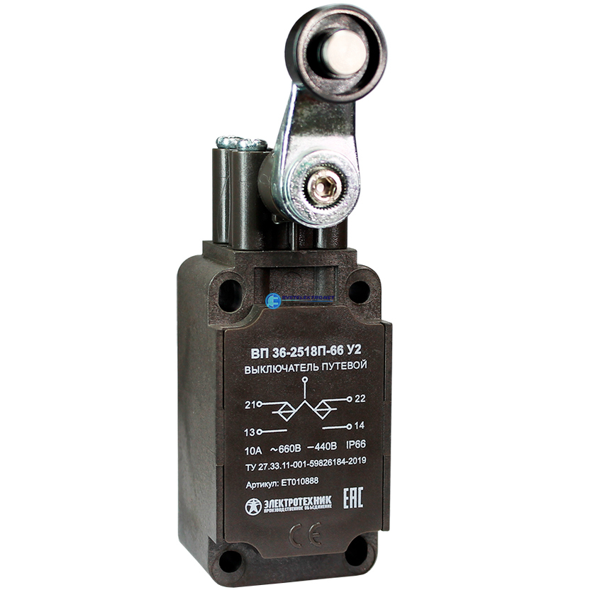 Выключатель путевой ВП 36-2518П-66 У2, рычаг с пластиковым роликом, 1з+1р, инерционный, 30х60 мм, без сальника, 3А, IP66, код ET010888, производитель Электротехник
