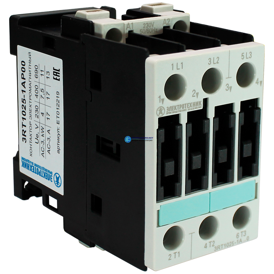 Контактор электромагнитный 3RT1025-1AP00, 3-пол., 17A, AC-3, 7,5кВт/400V, 230V AC, 50Гц, типоразмер S0, винтовые клеммы, IP20, код ET012219, производитель Электротехник