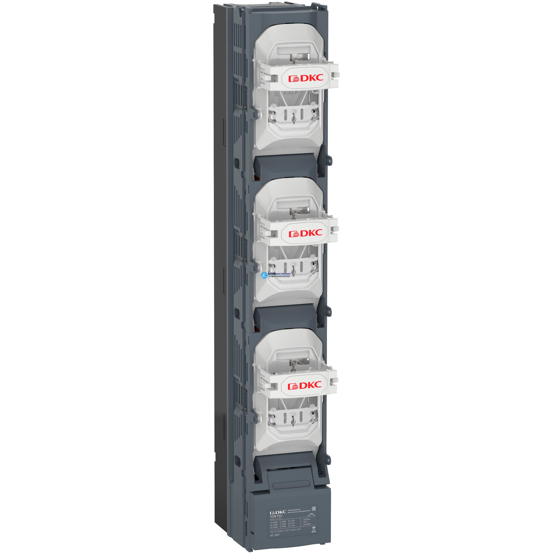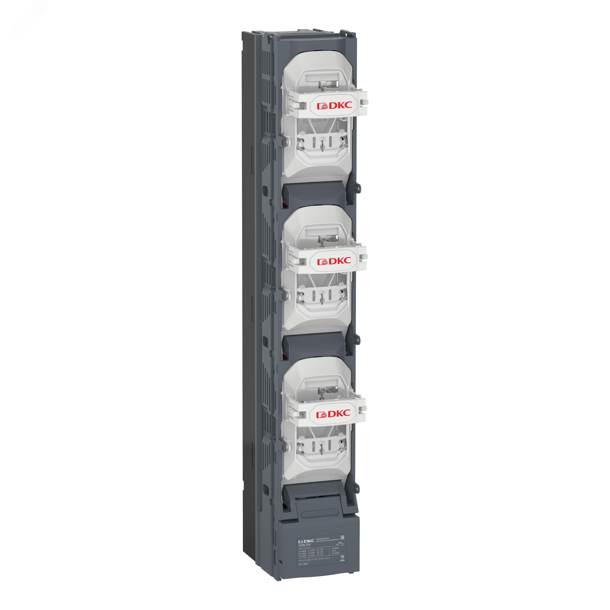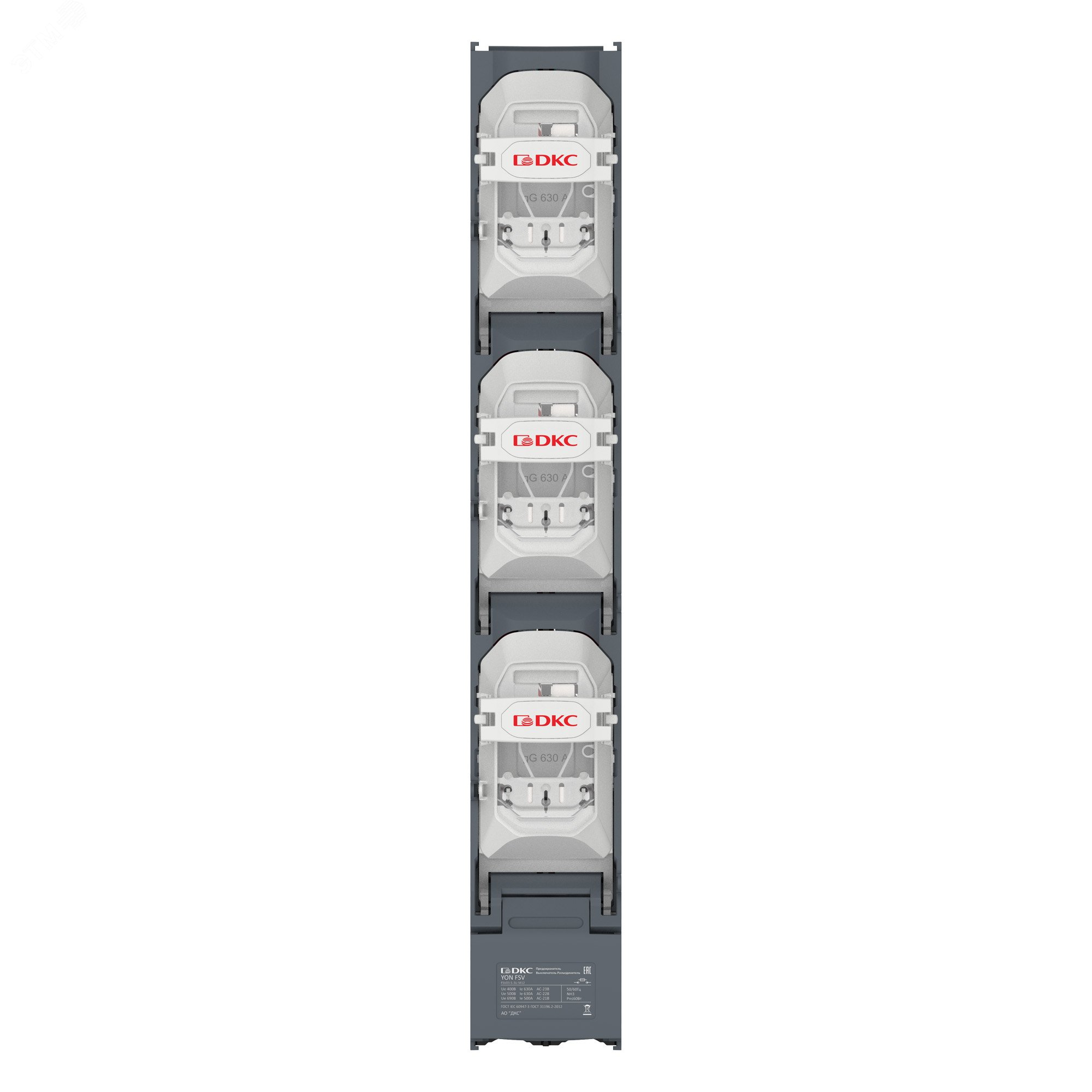 Вертикальный Предохранитель Выключатель Разъединитель 630А 3P с пополюсным отключением с выводами ласточкин хвост, код FSV03-S-3U-M12, производитель DKC