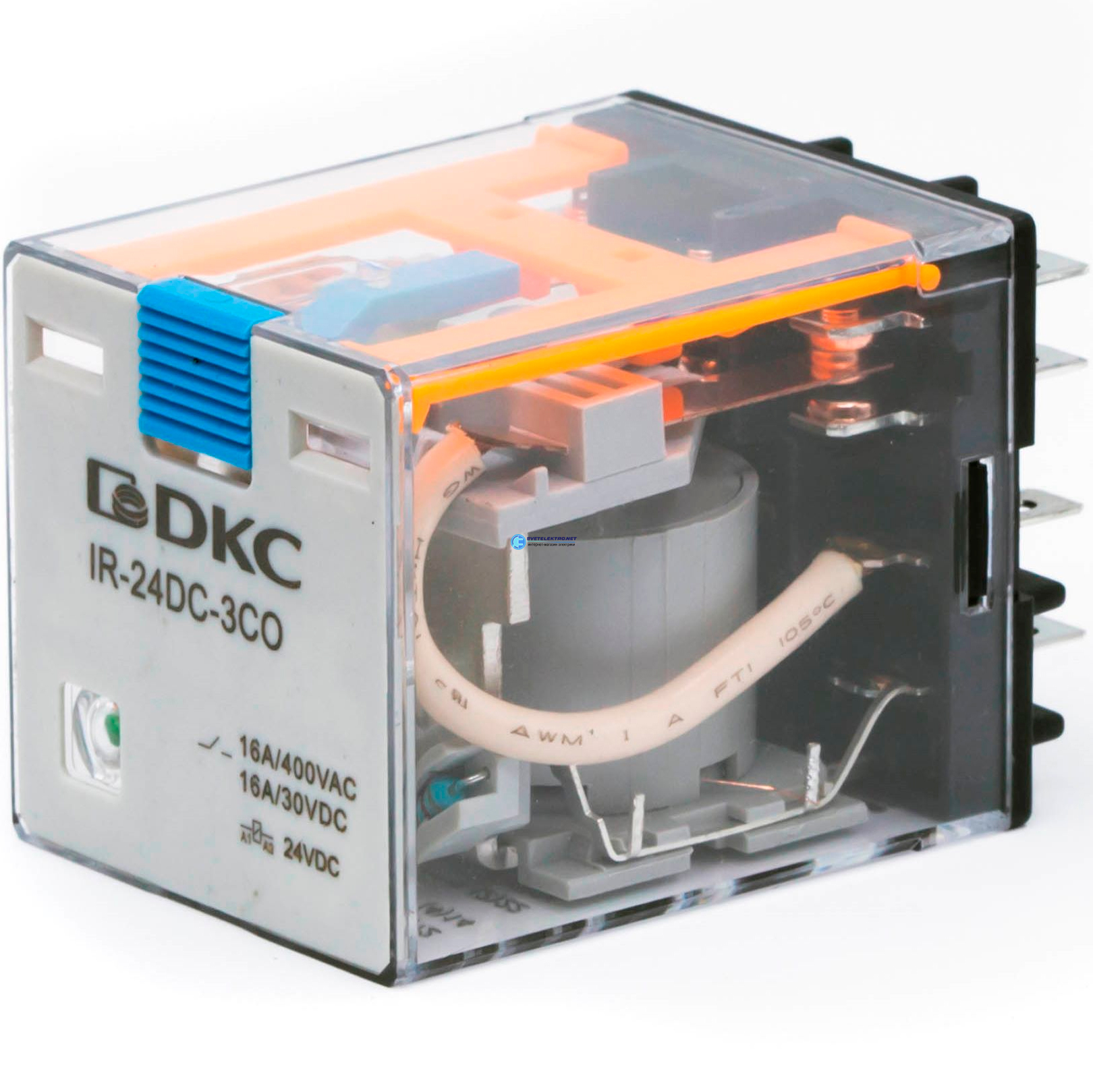 Реле миниатюрное силовое, 3CO, ком. ток 16А, AgSnO?, напряжение 220V DC, опция: тест-кнопка+светодиод+защитный диод, код IR-220DC-3CO-D, производитель DKC