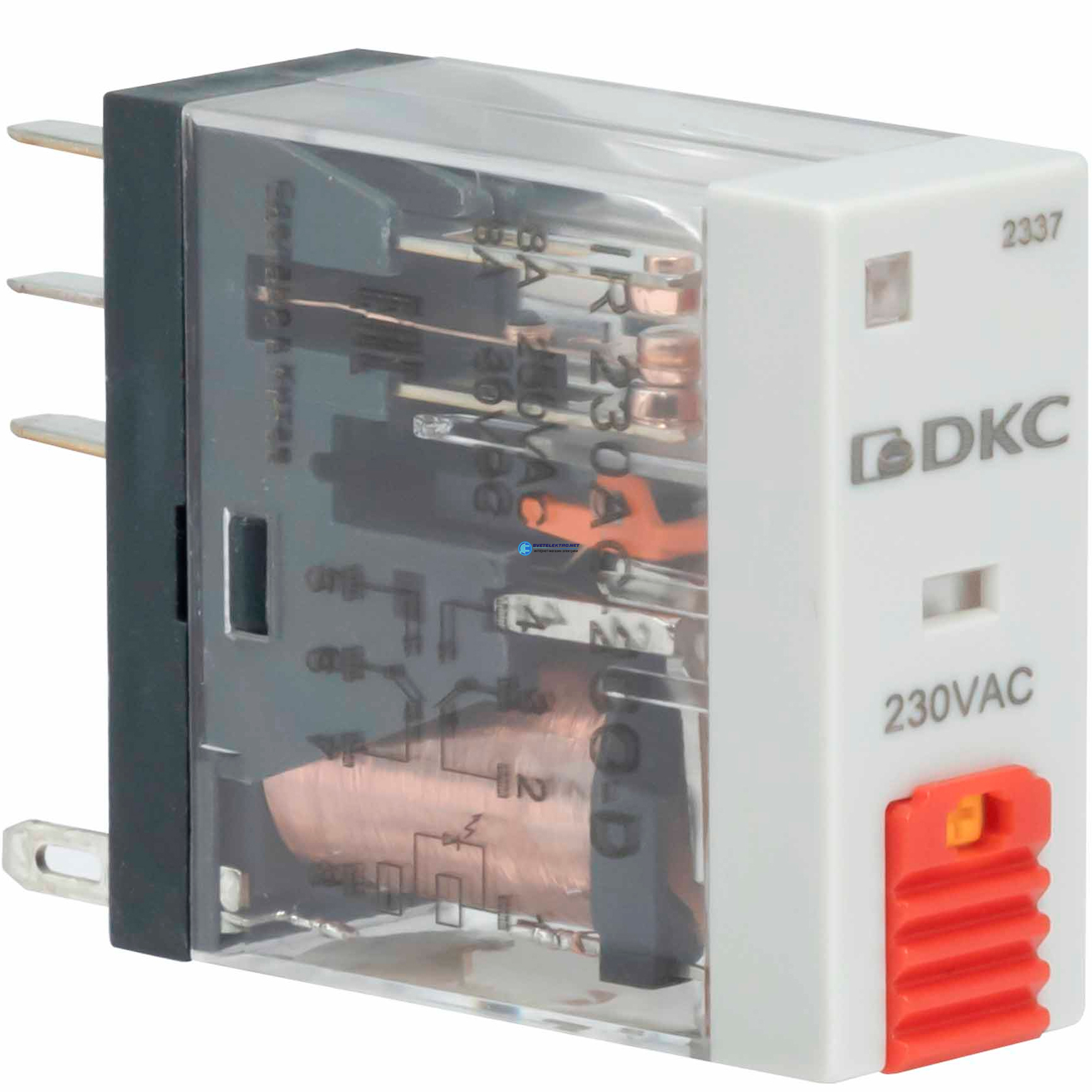 Реле миниатюрное промышленное, 2CO, ком. ток 8А, AgSnO?, напряжение 24V AC, опция: тест-кнопка+светодиод, код IR-24AC-2CO-D, производитель DKC