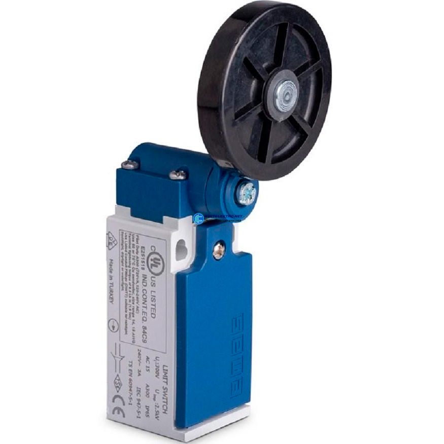 Концевой выключатель, привод реверсивный резиновый ролик 50 мм с угловым действием (1НЗ+1НО, мгновенное сраб.), серия L5, пластиковый корпус (240В AC,, код L5K13MEL121, производитель EMAS