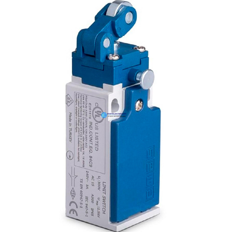 Выключатель концевой, привод однонаправленный металлический ролик 14 мм с угловым действием, с фиксацией 1НЗ+1НО, синхронное срабатывание, L5, пластик, код L5K23MIM311R, производитель EMAS