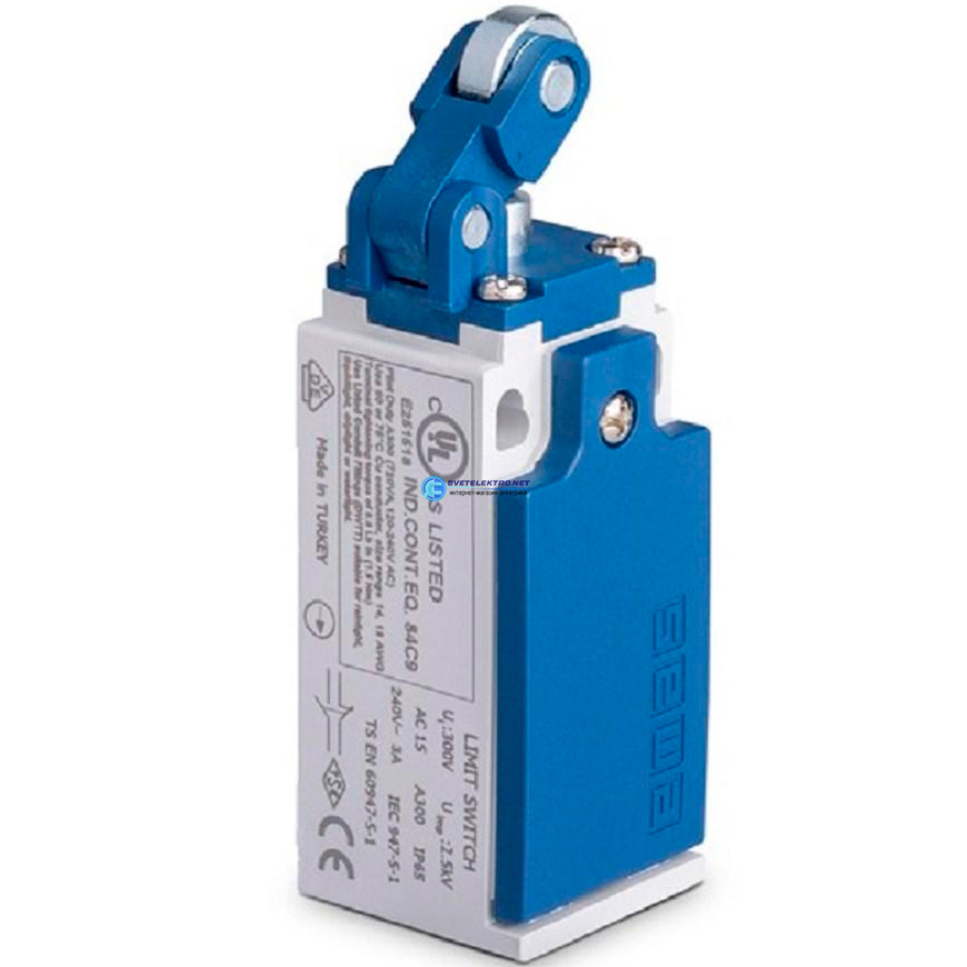 Концевой выключатель, привод однонаправленный металлический ролик 14 мм с угловым действием (2НЗ+1НО, синхронное сраб.), серия L5, пластиковый корпус, код L5K25MIM311, производитель EMAS