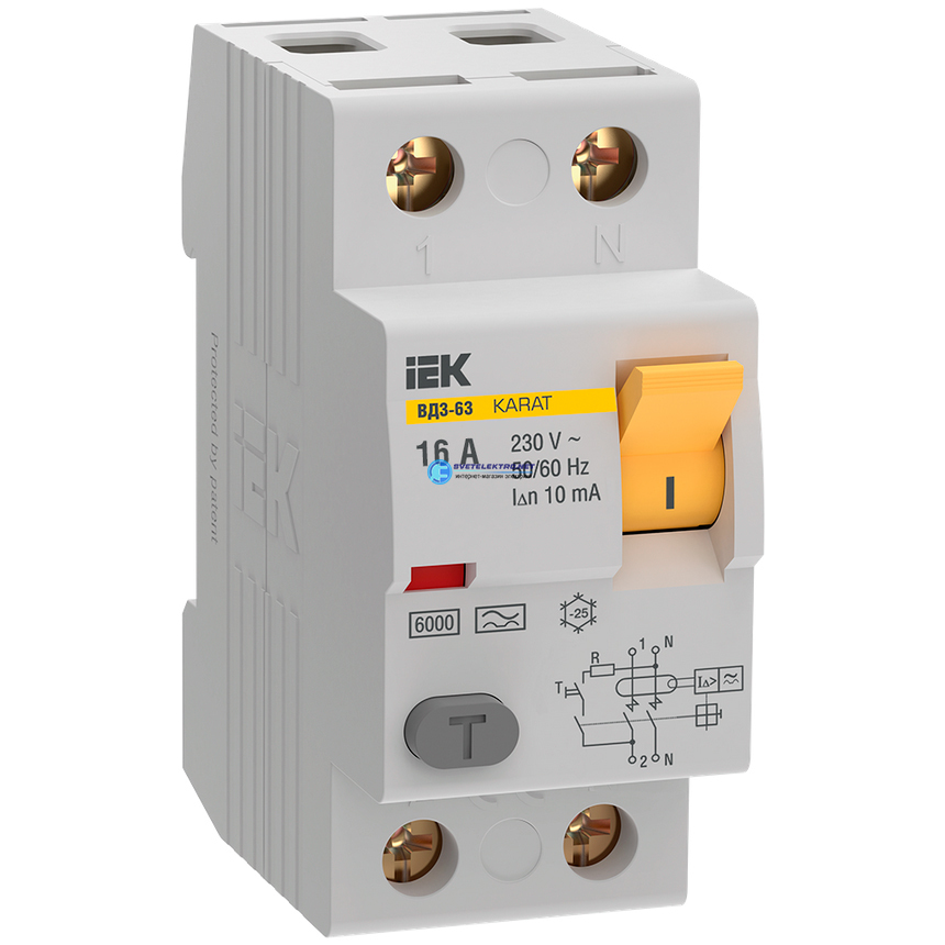 Выключатель дифференциальный (УЗО) KARAT ВД3-63 2P 16А 10мА 6кА тип A, код MDV21-2-016-010, производитель IEK