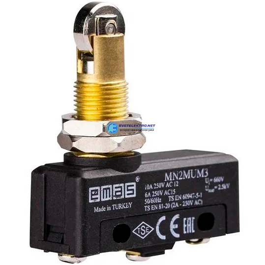 Мини-выключатель, привод роликовый плунжер (1ПК), пластиковый корпус (250В AC, 10А), код MN2MUM3, производитель EMAS