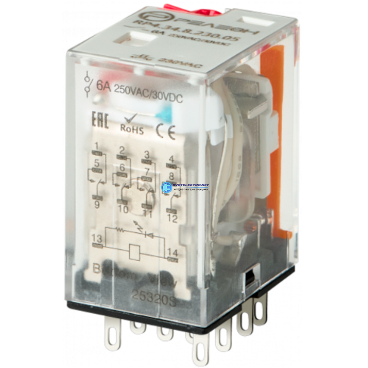 Промежуточное реле, перекидных контакта 6А ( AC) блокируемая кнопка проверки, светодиод, код RP434803605, производитель Релеон