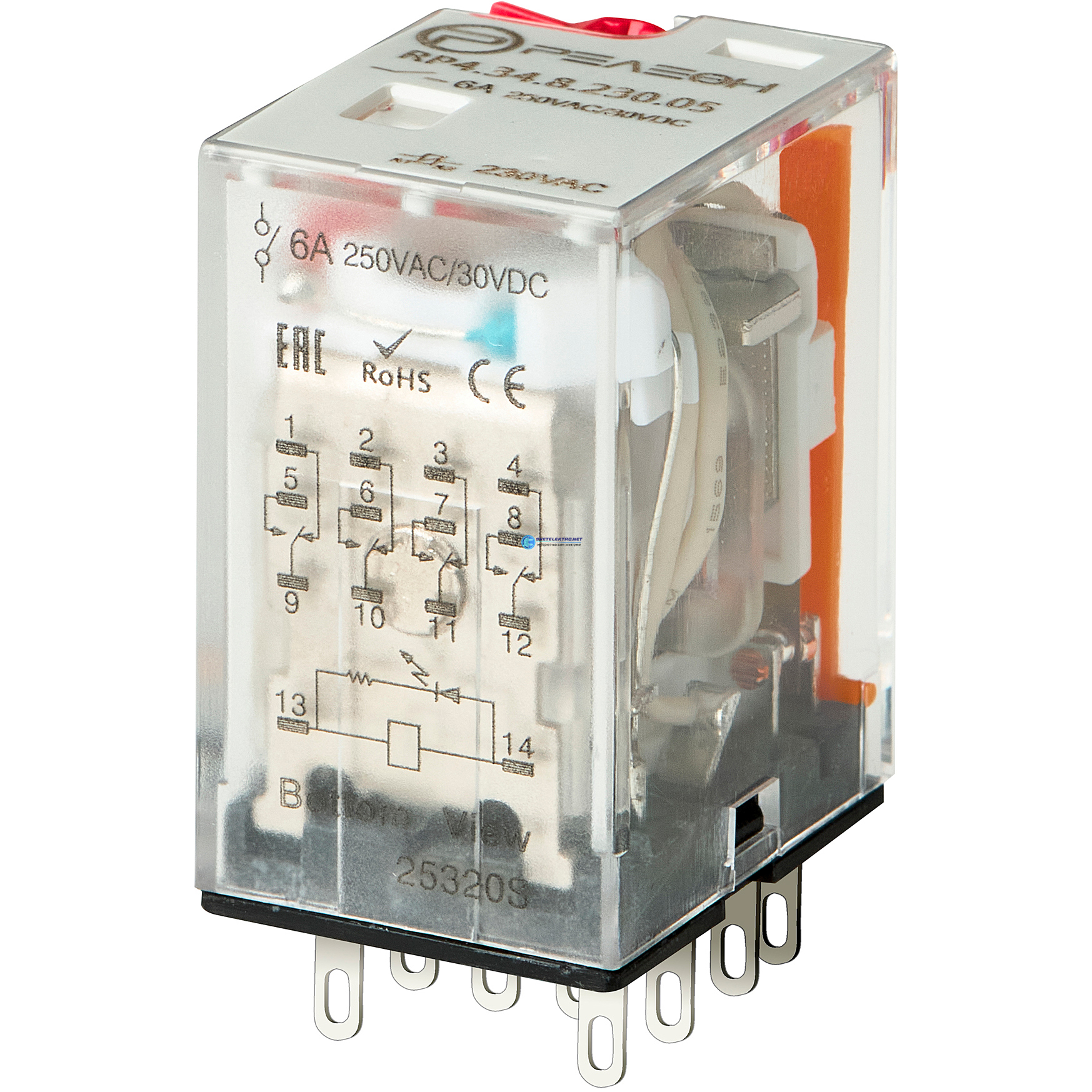 Промежуточное реле, перекидных контакта 6А ( 380В AC) блокируемая кнопка проверки, светодиод, код RP434838005, производитель Релеон