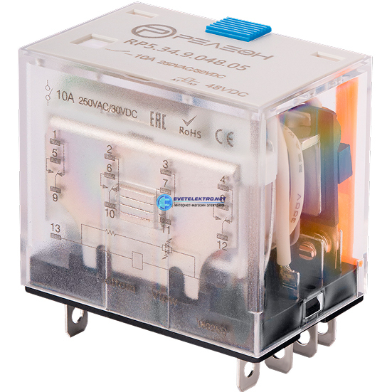 Миниатюрное силовое реле, перекидных контакта 10А ( DC) блокируемая кнопка проверки + светодиод, код RP534904805, производитель Релеон