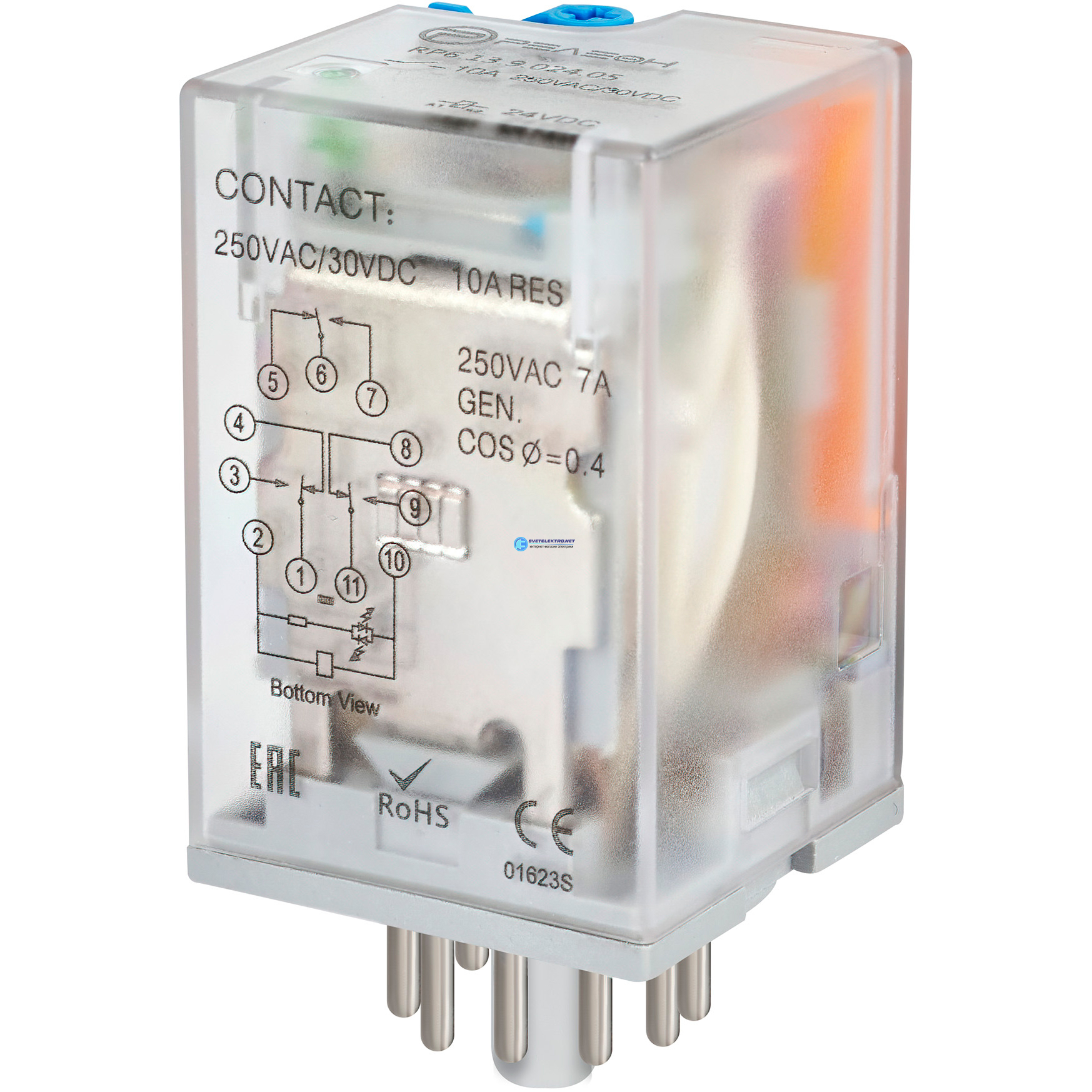 Универсальное реле, перекидных контакта 10А (24В DC) 11 штырьковый разъем, код RP613902405, производитель Релеон