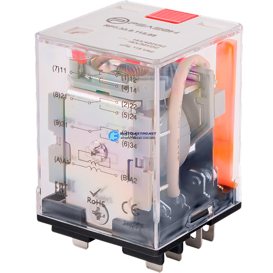 Силовое реле, переключающих контакта 16А, 115В AC, блокируемая кнопка проверки + светодиод, код RP733811505, производитель Релеон