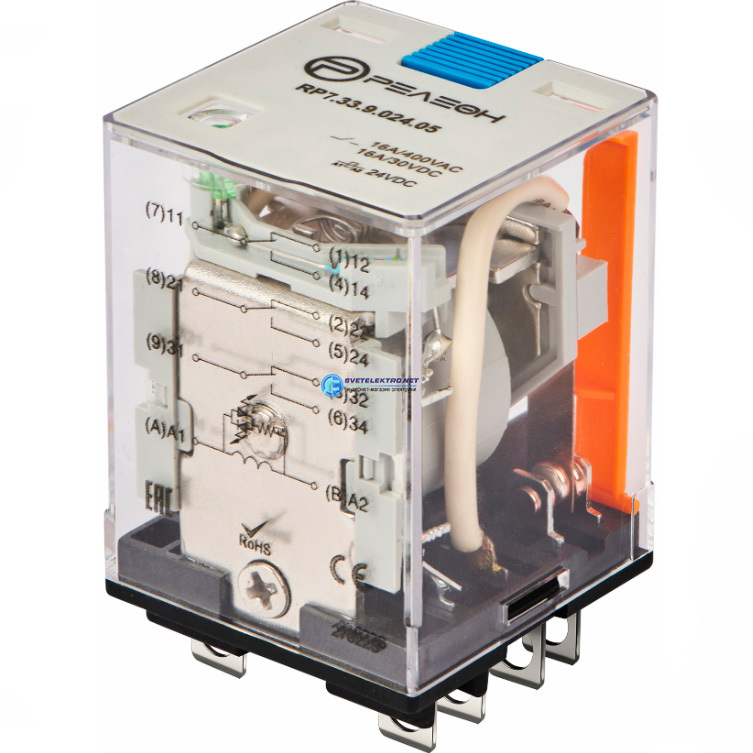 Силовое реле, переключающих контакта 16А, 24В DC, блокируемая кнопка проверки + светодиод, код RP733902405, производитель Релеон